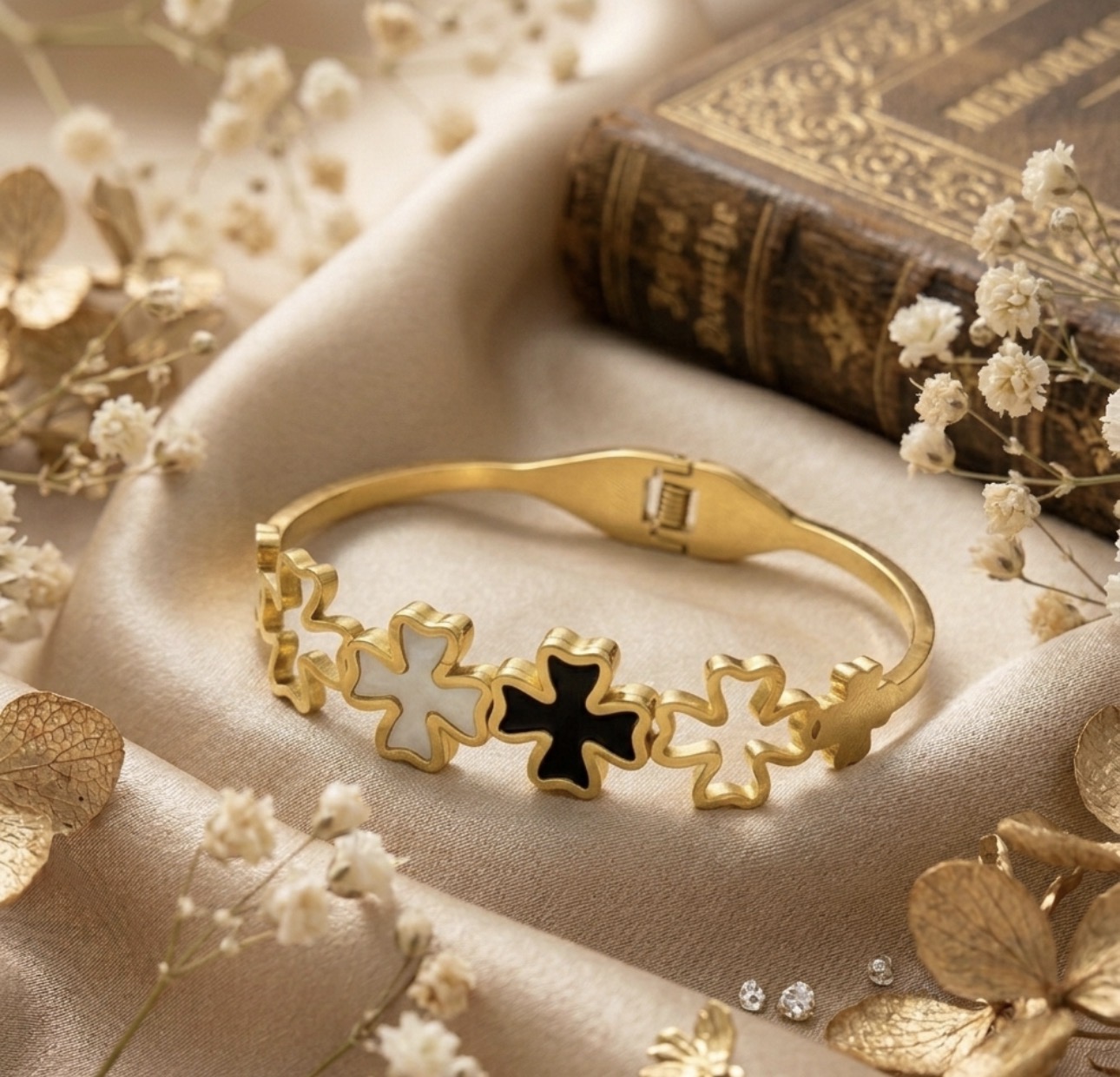 Black & white clover gold Bracelet, designed with a stunning blend of luxury and modern style.